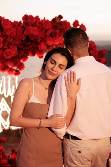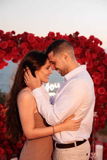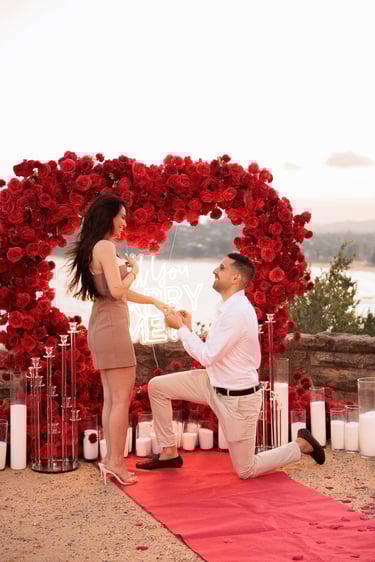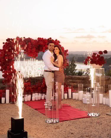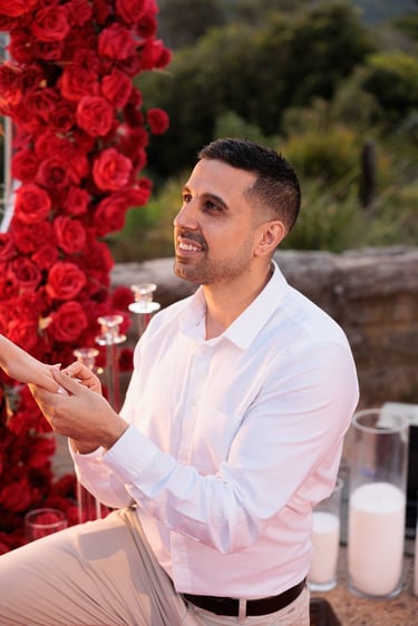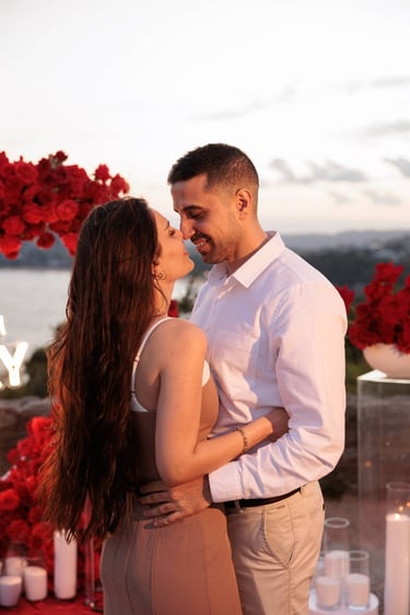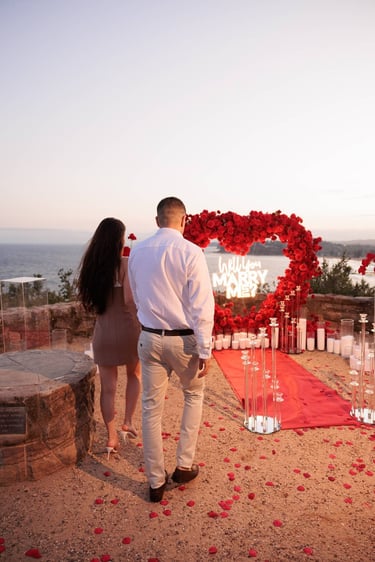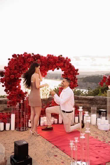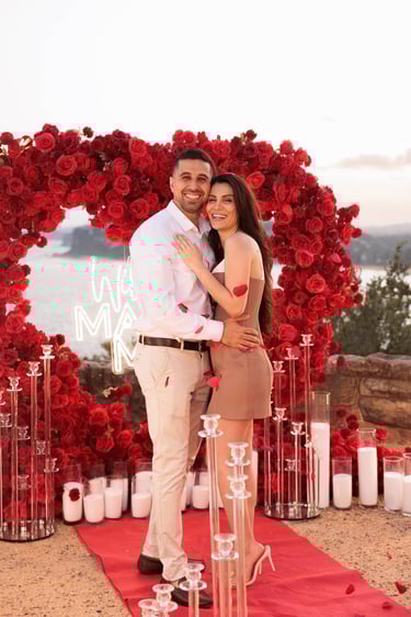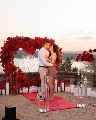Alex and Youna’s connection was incredible to witness. Their Northern Sydney cliffside proposal, framed by a glowing red love heart, was filled with emotion—tears of joy, heartfelt embraces, and the warmth of close friends. Every moment captured their deep bond, making it a truly beautiful celebration of love.