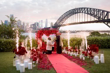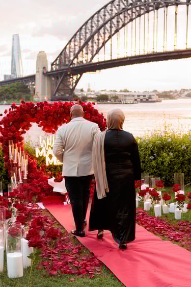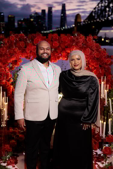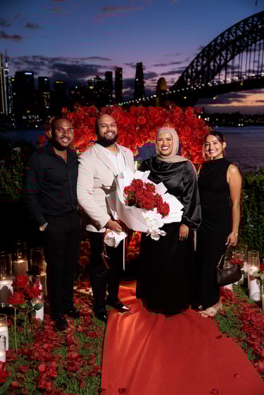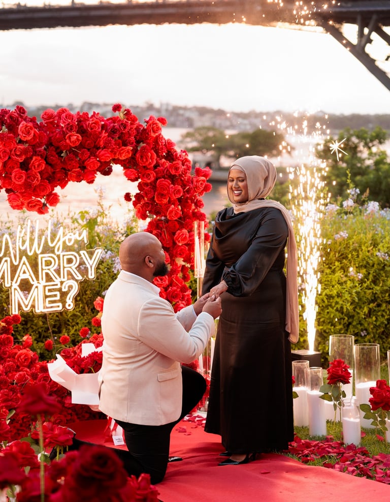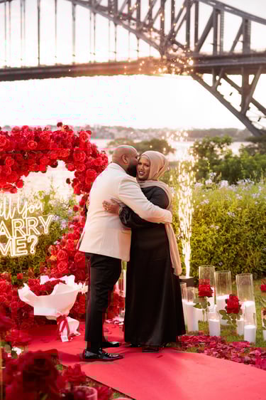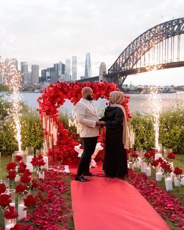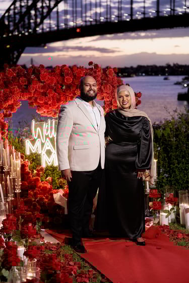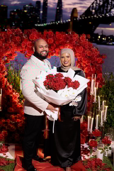 A spectacular Sydney Harbour proposal, set on the waterfront with dazzling floor sparklers and fireworks lighting up the night. Yasin and Wamia’s special moment was filled with excitement, joy, and pure emotion, creating an unforgettable celebration of their love in a breathtaking setting.